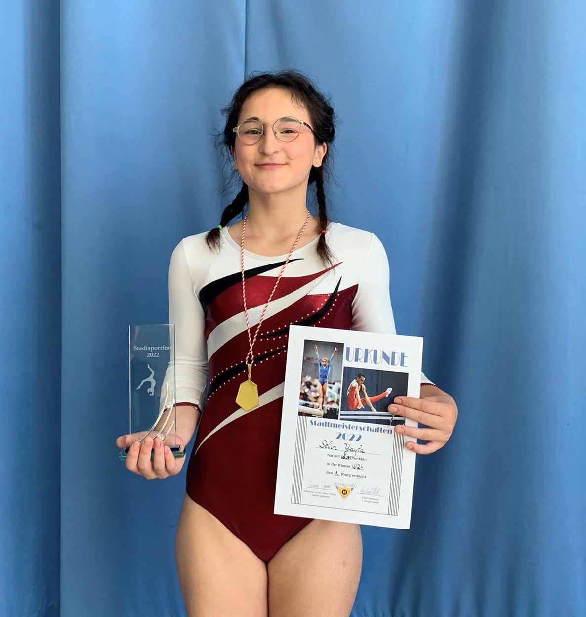 Selin Yayla startete zusammen mit den Turnerinnen der TSG Stadtbergen in der LK3. Leider verletzte sich Eva Rösch aus Stadtbergen nach dem zweiten Gerät, weshalb die Mannschaft hinter dem TSV Schwabmünchen und dem TSV Deuringen auf dem dritten Platz landete. Selin überzeugte an allen Geräten mit der höchsten Punktzahl und wäre bei einem Einzelwettkampf auf dem ersten Platz gelandet.