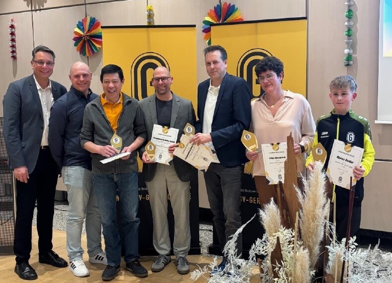 Die Ehrungen des TSV 1909 Gersthofen e.V.(v.l.): Arne Zießow (Präsident TSV Gersthofen), Stefan Bo-gesch, Le Huy Phan, Jerome Fisher, Stefan Liepert (Mannschaft des Jahres 2025), Irina Bychkova (Sportlerin des Jahres 2025 und Marco Seidel (Sportler des Jahres 2025)